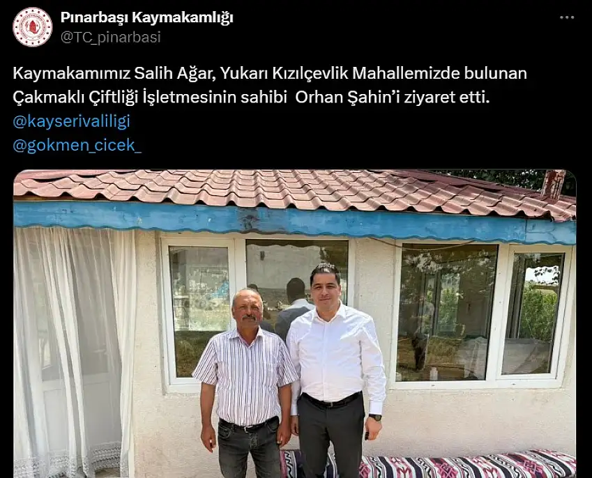 Pınarbaşı Kaymakamı Salih Ağar, Yukarı Kızılçevlik Mahallesi’nde faaliyet gösteren Çakmaklı Çiftliği’ni ziyaret etti. Ziyaretle ilgili bilgi, Pınarbaşı Kaymakamlığı’nın sosyal medya hesabından paylaşıldı. Açıklamada, Kaymakam Ağar’ın, çiftlik sahibi Orhan Şahin ile bir araya geldiği belirtildi.