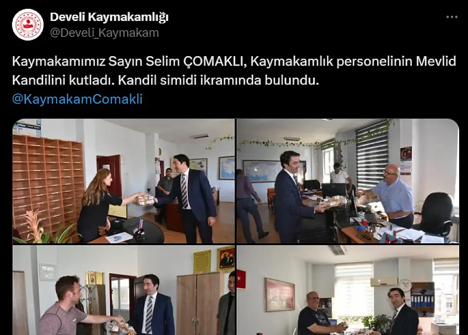 Develi Kaymakamı Selim Çomaklı, Mevlid Kandili dolayısıyla kaymakamlık personeliyle bir araya gelerek kandillerini kutladı. Kaymakamlık sosyal medya hesabından yapılan paylaşımda, Selim Çomaklı’nın çalışanlarla selamlaşarak kandil simidi ikram ettiği belirtildi. Kutlama kapsamında gerçekleşen ikram ve selamlaşma anları fotoğraflarla da paylaşıldı.