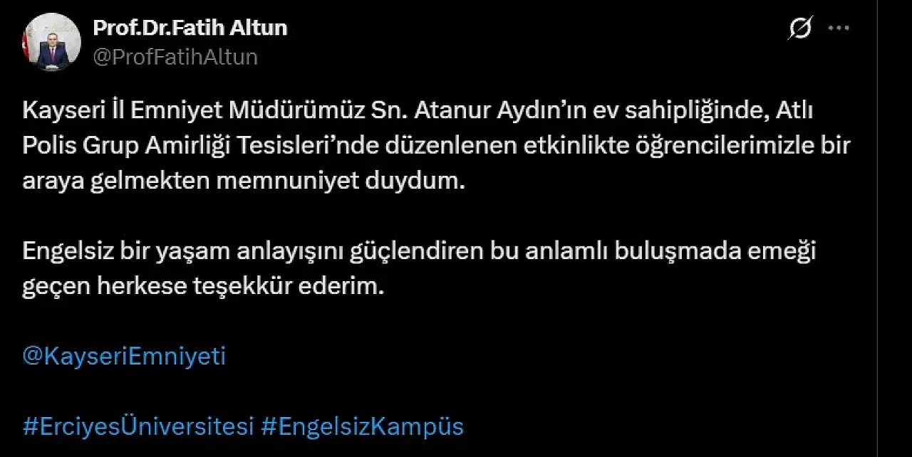 Erciyes Üniversitesi (ERÜ) Rektörü Prof. Dr. Fatih Altun, sosyal medya hesabından yaptığı paylaşımda, Kayseri İl Emniyet Müdürü Atanur Aydın’ın ev sahipliğinde düzenlenen etkinlikte öğrencilerle bir araya gelmekten memnuniyet duyduğunu belirtti. Altun, paylaşımında buluşmanın, engelsiz bir yaşam anlayışını güçlendiren anlamlı bir etkinlik olduğunu vurguladı ve organizasyonda emeği geçen herkese teşekkür etti. Etkinlik, öğrencilerin emniyet birimleri ile bir araya gelerek sosyal ve kültürel etkileşimde bulunmalarına olanak sağladı.