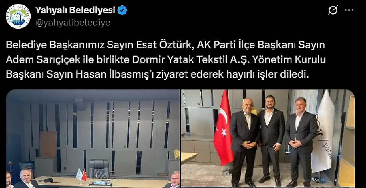 Yahyalı Belediyesi, sosyal medya hesabından yaptığı paylaşımda, Belediye Başkanı Esat Öztürk’ün AK Parti İlçe Başkanı Adem Sarıçicek ile birlikte Dormir Yatak Tekstil A.Ş. Yönetim Kurulu Başkanı Hasan İlibaş’ı ziyaret ettiğini duyurdu.