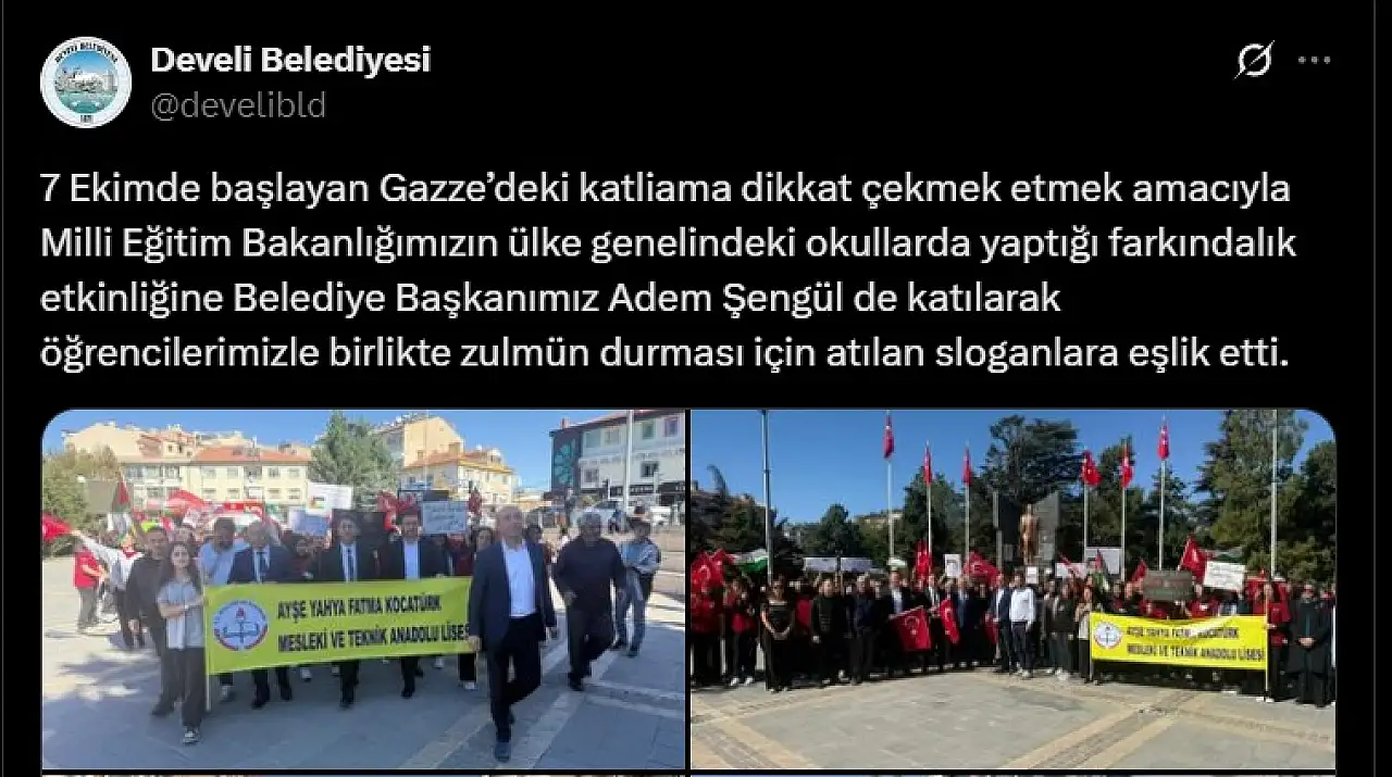 Develi Belediyesi, sosyal medya hesabı üzerinden yaptığı açıklamada, Gazze’de 7 Ekim’de başlayan katliama dikkat çekmek amacıyla ülke genelinde okullarda düzenlenen farkındalık etkinliğine Belediye Başkanı Adem Şengül’ün katıldığını duyurdu. Açıklamada, Başkan Şengül’ün etkinlikte öğrencilerle bir araya geldiği ve zulmün durması için atılan sloganlara eşlik ettiği belirtildi. Milli Eğitim Bakanlığı tarafından ülke genelinde organize edilen bu etkinlik, öğrencilerin bilinçlenmesini sağlamak ve Gazze’de yaşanan insanlık dramına dikkat çekmek amacıyla gerçekleştirildi.