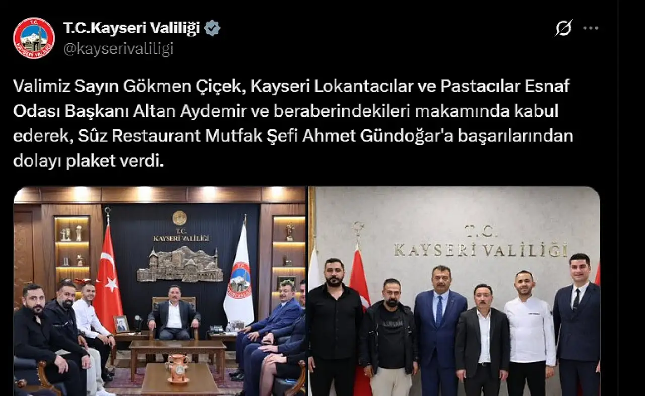 Kayseri Valiliği, sosyal medya hesabından yaptığı paylaşımda, Valisi Gökmen Çiçek’in Kayseri Lokantacılar ve Pastacılar Esnaf Odası Başkanı Altan Aydemir ve beraberindekileri makamında kabul ettiğini duyurdu. Paylaşımda, ziyarette Süz Restaurant Mutfak Şefi Ahmet Gündoğar’a başarılarından dolayı plaket verildiği belirtildi. Valilik açıklamasında, Gündoğar’ın gösterdiği üstün başarı ve mesleki katkılarının takdir edildiği vurgulandı.