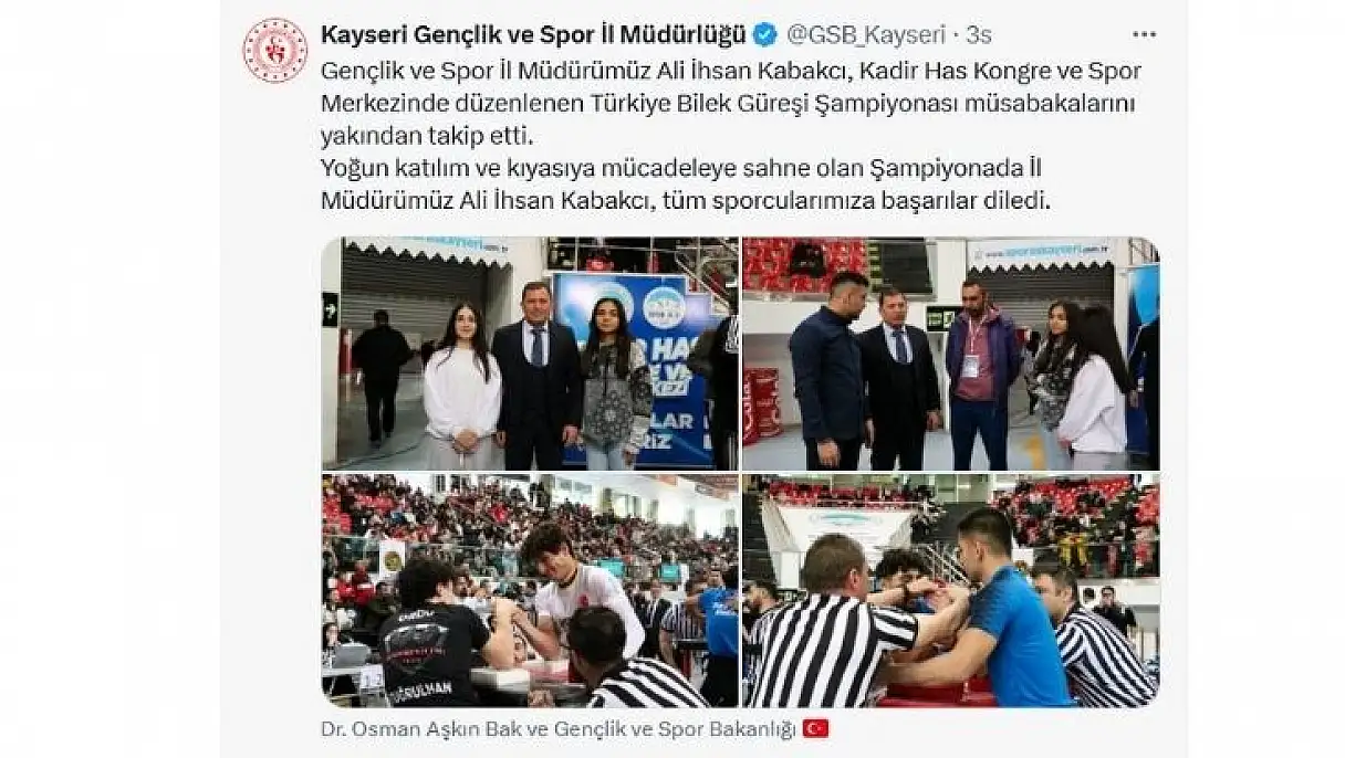 Gençlik ve Spor İl Müdürü Ali İhsan Kabakcı, Kadir Has Kongre ve Spor Merkezinde düzenlenen Türkiye Bilek Güreşi Şampiyonası müsabakalarını yakından takip etti. Yoğun katılım ve kıyasıya mücadeleye sahne olan Şampiyonada İl Müdürü Ali İhsan Kabakcı, tüm sporculara başarılar diledi.