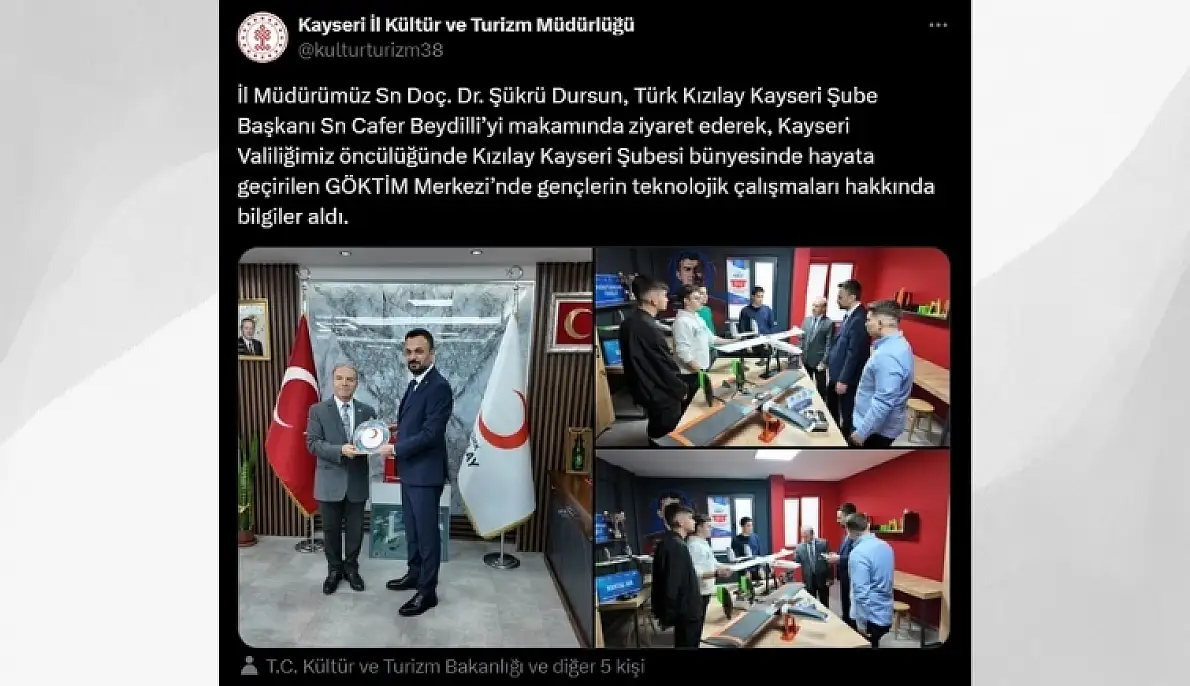 Kayseri Kültür ve Turizm İl Müdürü Şükrü Dursun, Türk Kızılay Kayseri Şube Başkanı Cafer Beydilli’yi makamında ziyaret ederek, Kayseri Valiliği öncülüğünde Kızılay Kayseri Şubesi bünyesinde hayata geçirilen GÖKTİM Merkezi’nde gençlerin teknolojik çalışmaları hakkında bilgiler aldı.