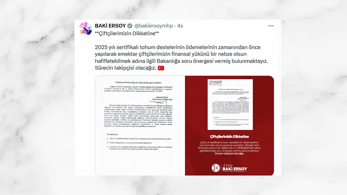 MHP Milletvekili Baki Ersoy, 2025 yılı sertifikalı tohum destelerinin ödemelerinin zamanından önce yapılarak çiftçilerin finansal yükünü hafifletebilmek adına ilgili Bakanlığa soru önergesi verdi.