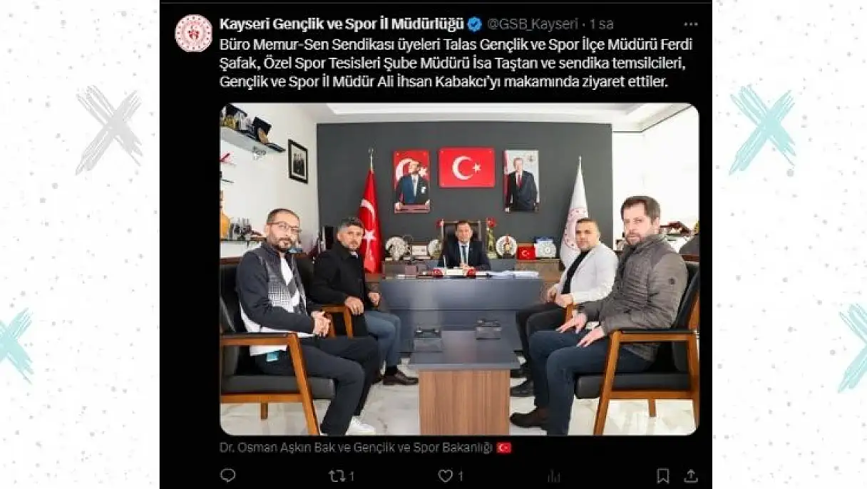 Büro Memur-Sen Sendikası üyeleri Talas Gençlik ve Spor İlçe Müdürü Ferdi Şafak, Özel Spor Tesisleri Şube Müdürü İsa Taştan ve sendika temsilcileri, Gençlik ve Spor İl Müdür Ali İhsan Kabakcı’yı makamında ziyaret ettiler.