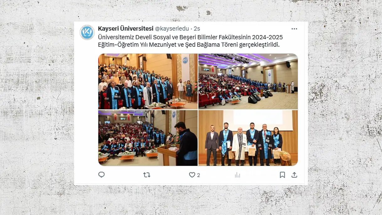 Haberler Güncel Kayseri'de sosyal medyada öne çıkanlar (27 Haziran) Kayseri'de sosyal medyada öne çıkanlar (27 Haziran) Kayseri'de sosyal medyada öne çıkan gelişmeleri sizler için derledik. Detaylar Kayseri Anadolu Haber'de... sosyal medya PAYLAŞ 27.06.2025 16:38 Güncelleme: 27.06.2025 16:38 Muhammed KösedağMuhabir TAKİP ET 4 6 PAYLAŞ Kayseri Üniversitesi Develi Sosyal ve Beşeri Bilimler Fakültesinin 2024-2025 Eğitim-Öğretim Yılı Mezuniyet ve Şed Bağlama Töreni gerçekleştirildi.