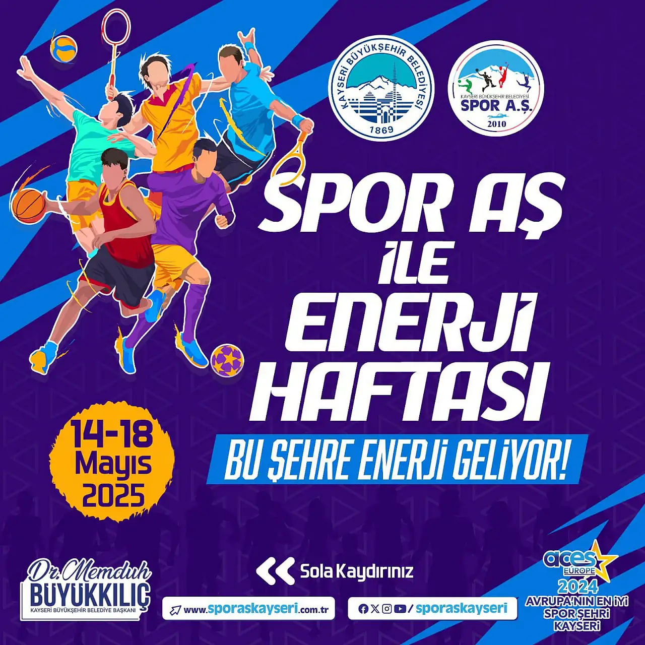 Kayseri Büyükşehir Belediyesi Spor A.Ş. 19 Mayıs Atatürk'ü Anma, Gençlik ve Spor Bayramı kutlamaları kapsamında Enerji Haftası Etkinlikleri düzenliyor. Etkinlikler 5 gün boyunca tüm halkı bekliyor. Detaylar Kayseri Anadolu Haber'de...