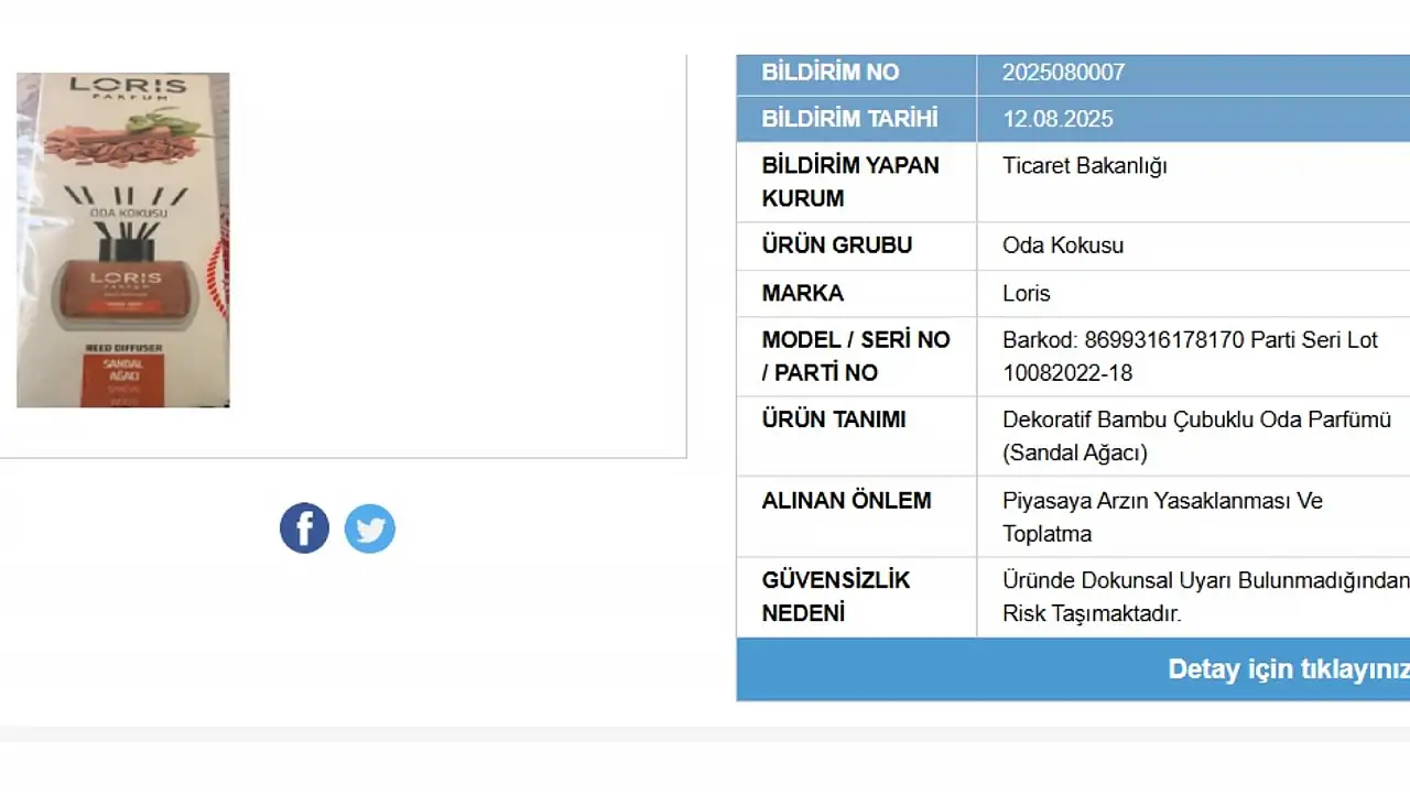 Okuyucular Gıda Kozmetik Turizm Ticaret Ve Sanayi Limited Şirketi’ne ait Loris Dekoratif Bambu Çubuklu Oda Parfümünün (Sandal Ağacı) (Barkod: 8699316178170 Parti Seri Lot 10082022-18) sağlık riski taşıdığı belirtiliyor. Güvensizlik nedeni ise üründe dokunsal uyarı bulunmadığından risk taşıdığı şeklinde ifade edildi.