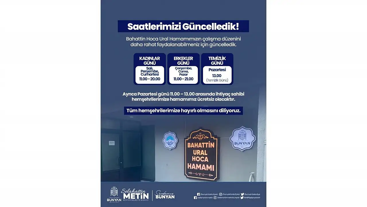 Kayseri'de tarihi Bahattin Ural Hoca Hamamı'nın çalışma saatleri güncellendi. Belediye Başkanı Selahattin Metin, yeni çalışma saatlerini sosyal medya hesabından paylaştı. Detaylar haberimizde….