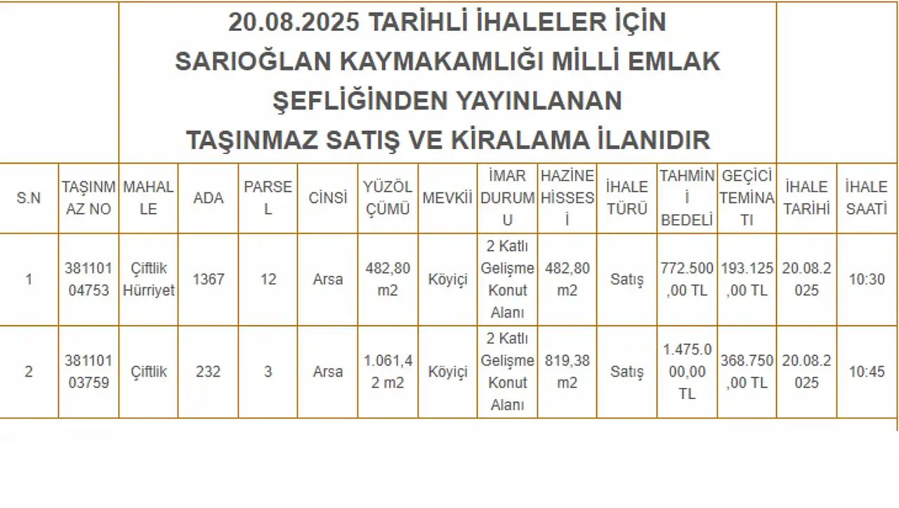 Sarıoğlan Kaymakamlığı Milli Emlak Şefliği, uygun fiyat fırsatı ile 2 arsayı satışa, 9 arsayı ise kiralama olarak ihaleye çıkardı. Satışa çıkan arsaların imar durumu konut alanı olarak ifade edildi. Kiralamak için ilana çıkan arsalar ise imarsız ham toprak ve tarla olarak ihaleye çıktı.