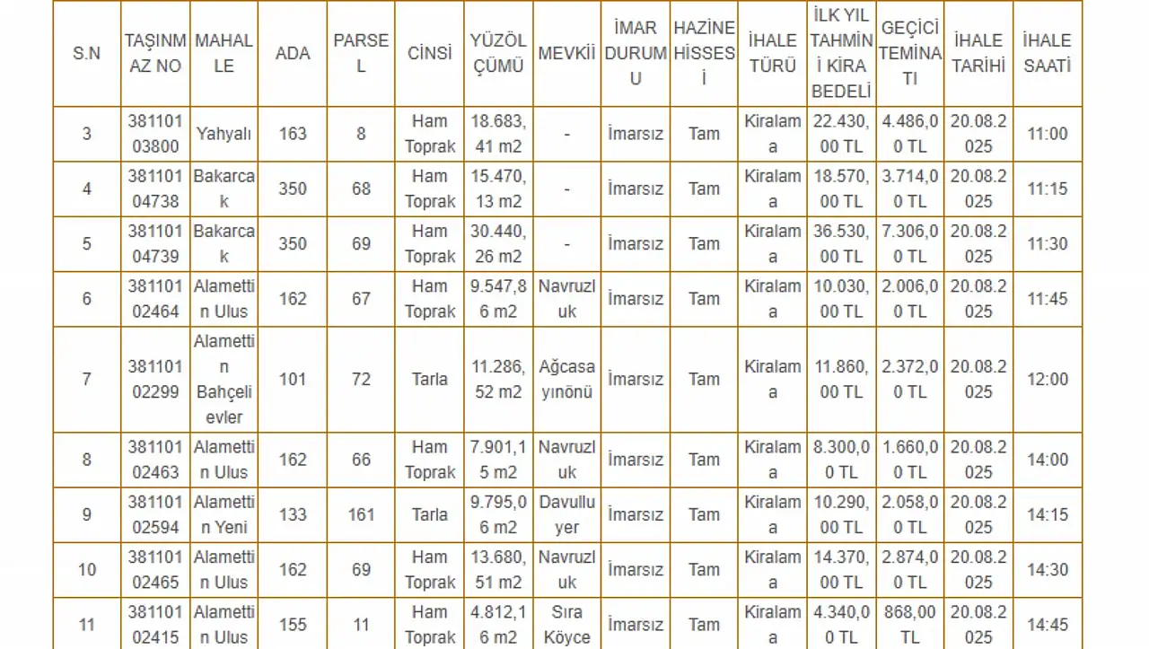 Yayınlanan ilanda ihalenin yeri ve ne zaman yapılacağı detaylı olarak aktarıldı. 20 Ağustos Çarşamba günü 10.30’da başlayacak ihale, tek tek 15 dakika aralıklarla Sarıoğlan Milli Emlak Şefliği’nde yapılacak. Geçici teminat bedeli saat 15.00'e kadar gün içinde ve ihale saatinden en az 10 dakika önce olmak koşuluyla Sarıoğlan Malmüdürlüğü veznesine veya Sarıoğlan Mal Müdürlüğünün Ziraat Bankası hesabına yapılacak. Her taşınmaz için ayrı yatırılacak olan geçici teminat tahmini bedelin en az yüzde 25’i civarında olacak.