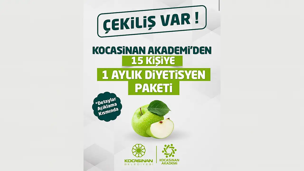 Kocasinan Belediyesi, Kocasinan Akademi tarafından yapılan sosyal medya paylaşıma göre 15 kişiye 1 ay süreyle ücretsiz olarak diyetisyen hizmeti sunulacak. Kocasinan Akademi tarafından yapılan paylaşım kısa sürede çok sayıda beğeni ve yorum alırken çekilişe katılmak için çok az şart bulunuyor.