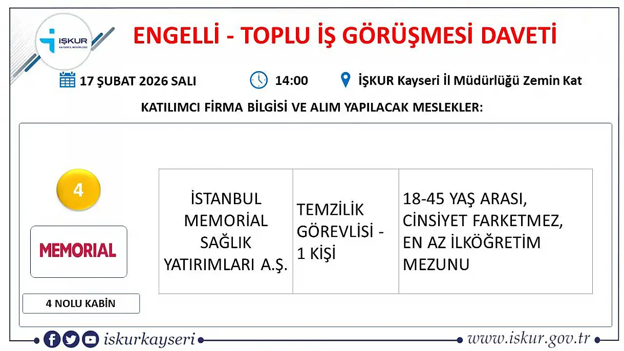 İŞKUR Kayseri İl Müdürlüğü tarafından yapılan duyuruya göre kent genelinde faaliyet gösteren 4 farklı firmada istihdam edilmek üzere engelli personel alımı gerçekleştirilecek. Detaylar Kayseri Anadolu Haber'de...