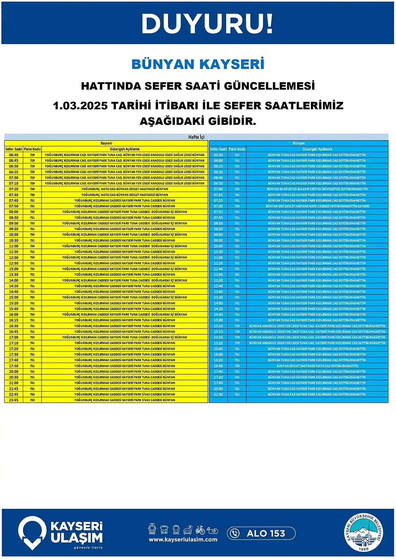 Bünyan Kayseri Hattında Sefer Saati Güncellemesi