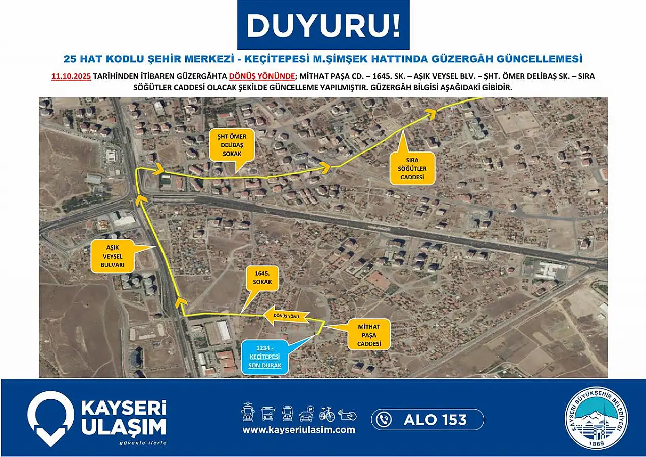 Kayseri Büyükşehir Belediyesi Kayseri Ulaşım A.Ş. tarafından yapılan duyuruya göre Kayseri'de çok sayıda ilçe ve mahalleyi ilgilendiren önemli ulaşım değişiklikleri 11 Ekim 2025 Cumartesi günü itibariyle yürürlüğe giriyor.