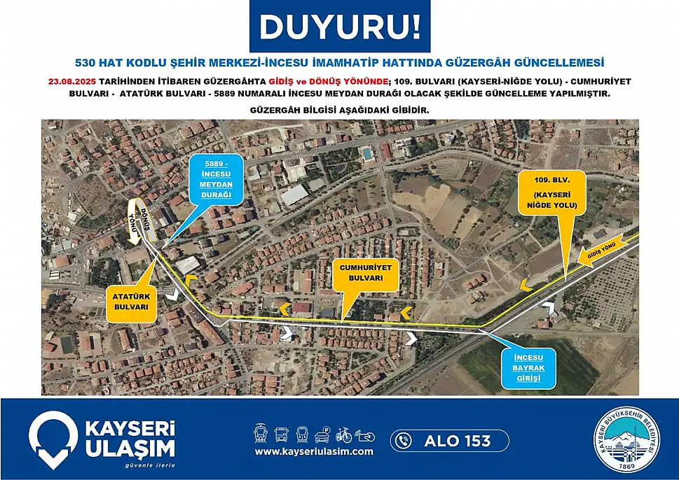 Kayseri Ulaşım A.Ş. tarafından yayımlanan 23 Ağustos 2025 tarihli yeni duyuruya göre şehir genelindeki otobüs hatlarında çok sayıda mahalle ve ilçeyi ilgilendiren önemli değişiklikler yapıldı. Detaylar Kayseri Anadolu Haber'de…