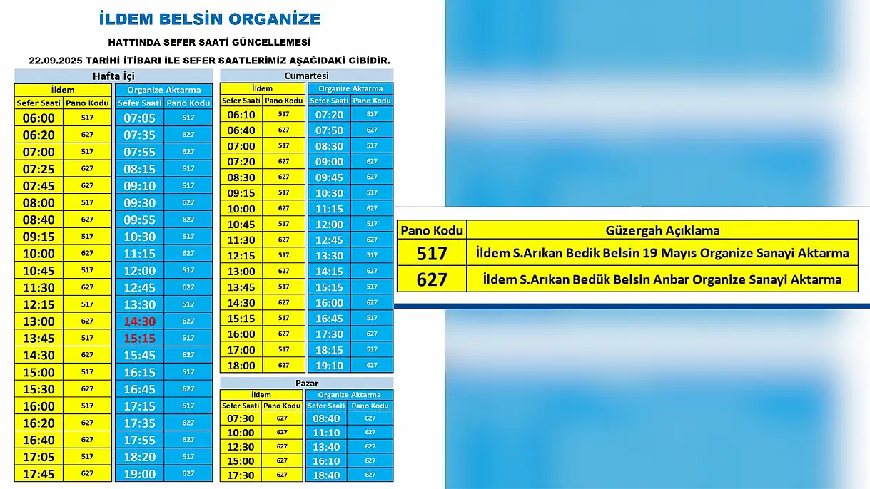 Kayseri Büyükşehir Belediyesi iştirak şirketi olan Kayseri Ulaşım A.Ş. tarafından yayımlanan duyuruya göre Kayseri'de yarın (20 Eylül 2025) itibariyle çok sayıda güzergah ve sefer saatinde düzenleme ve değişikliğe gidildiği duyuruldu. Detaylar Kayseri Anadolu Haber'de...