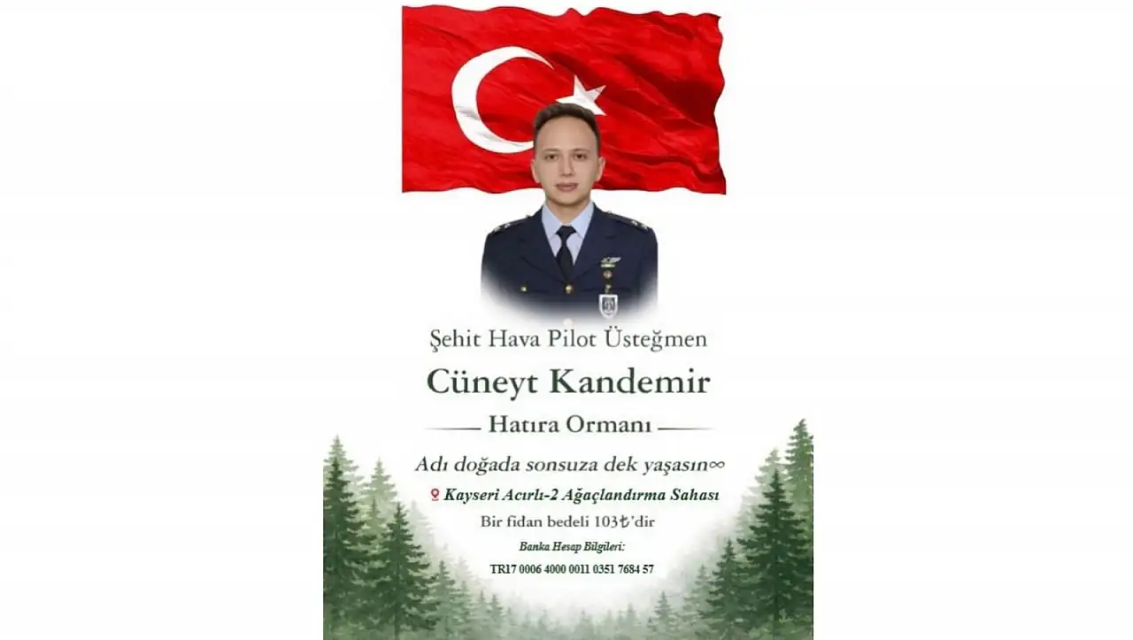 Şehit Hava Pilot Üsteğmen Cüneyt Kandemir’in aziz hatırasını yaşatmak amacıyla, Kayseri Acırlı-2 Ağaçlandırma Sahası’nda Cüneyt Kandemir Hatıra Ormanı oluşturulacak. Şehit Kandemir için TEMA Vakfı aracılığıyla yapılacak hatıra ormanına isteyen vatandaşlar fidan bağışında bulunabilecek.
