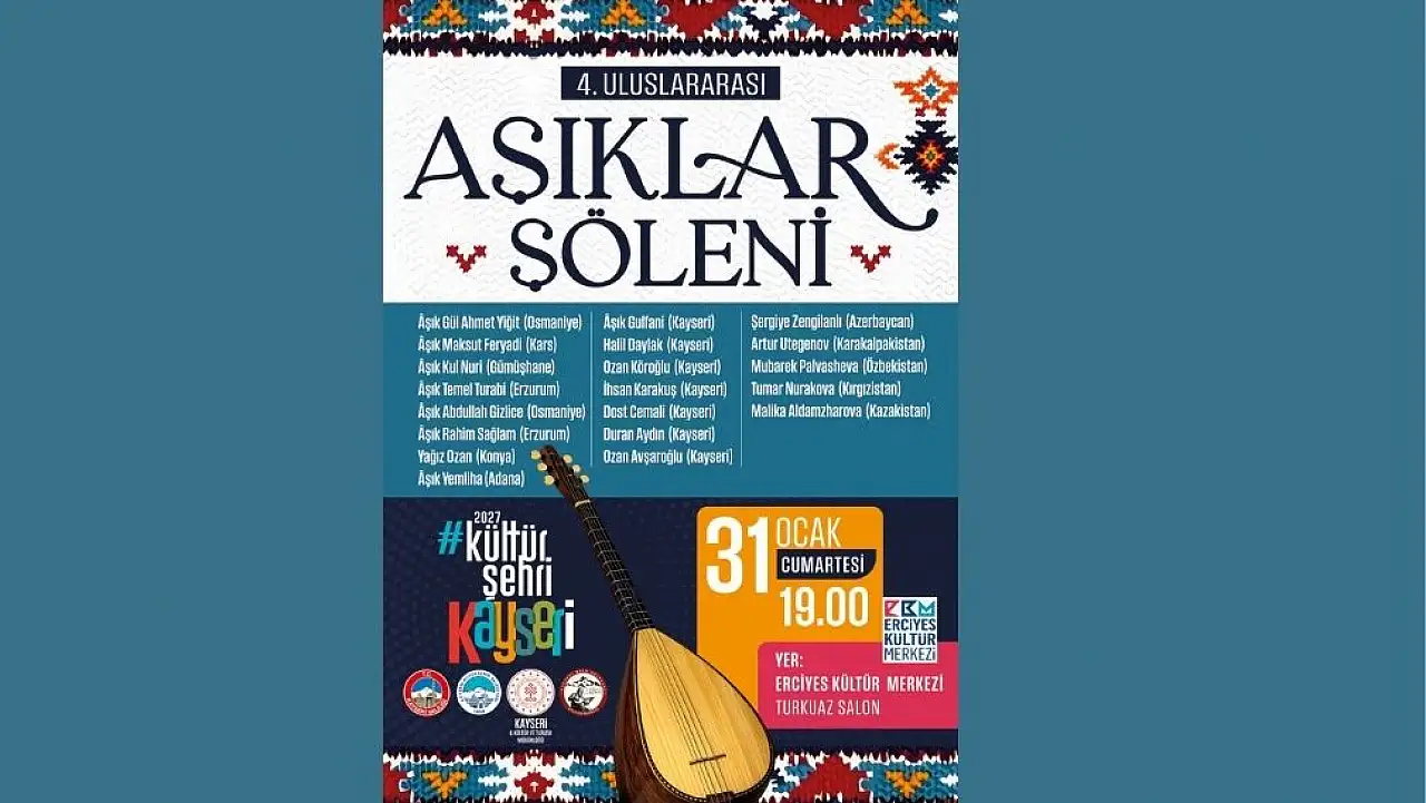 Kayseri Valiliği, Kayseri Büyükşehir Belediyesi, İl Kültür ve Turizm Müdürlüğü ile Kayseri Halk Ozanları Kültür Derneği’nin ortak çalışmasıyla düzenlenecek 4. Uluslararası Âşıklar Şöleni, 31 Ocak Cumartesi günü saat 19.00’da Erciyes Kültür Merkezi Turkuaz Salon’da gerçekleşecek.