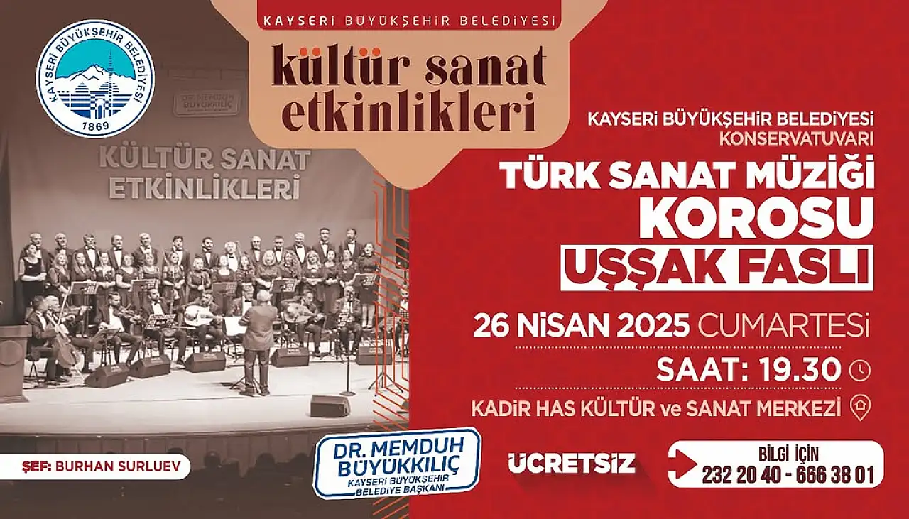 Başkan Dr. Memduh Büyükkılıç’ın kültür ve sanata verdiği önem doğrultusunda düzenlenen etkinliklerden biri de Kayseri Büyükşehir Belediyesi Konservatuvarı Türk Sanat Müziği Korosu’nun ‘Uşşak Faslı’ konseri olacak.