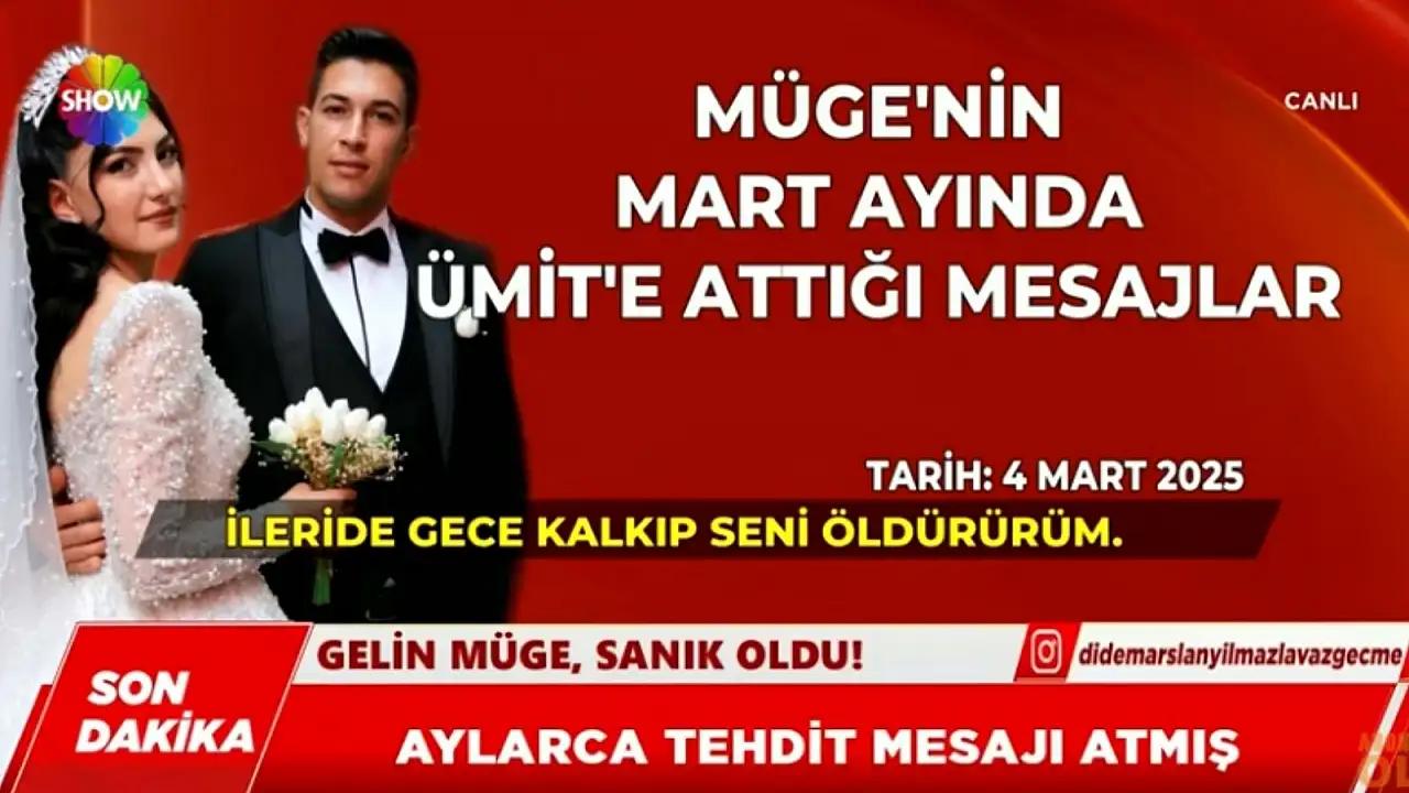 Show TV ekranlarında izleyicisiyle buluşan Didem Arslan Yılmaz’la Vazgeçme Programı’nda Kayseri’de düğün gecesi hayatını kaybeden Ümit Canpolat dosyasında yeni gelişmeler kamuoyu ile paylaşıldı. Gelin Müge’nin damat Canpolat’a çok sayıda tehdit içerikli mesaj yazdığı ortaya çıktı.