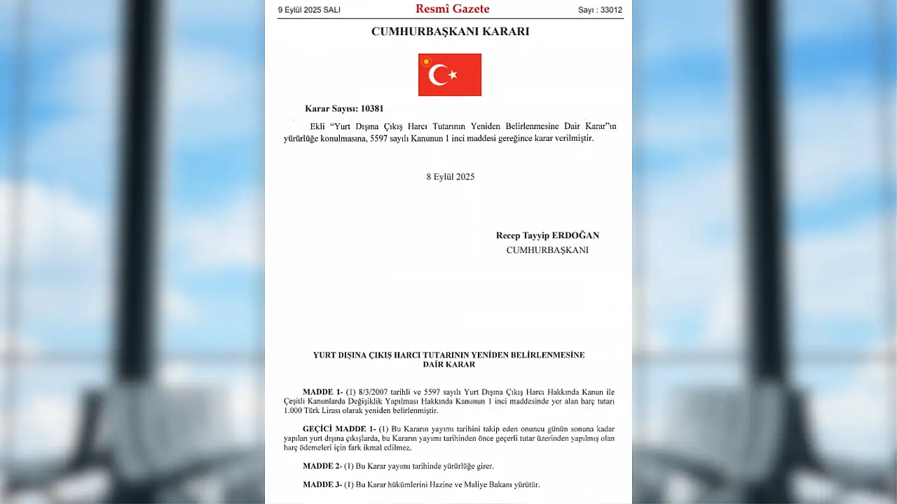 Yurt dışına çıkış harcı en son Ocak 2025 itibariyle yıl başında belirlenmiş ve rakam 710 TL yükseltilmişti. Resmi Gazete'de yayımlana kararla 9 Eylül 2025 tarihi itibariyle bu seferde 1000 TL'ye çıkarıldı.