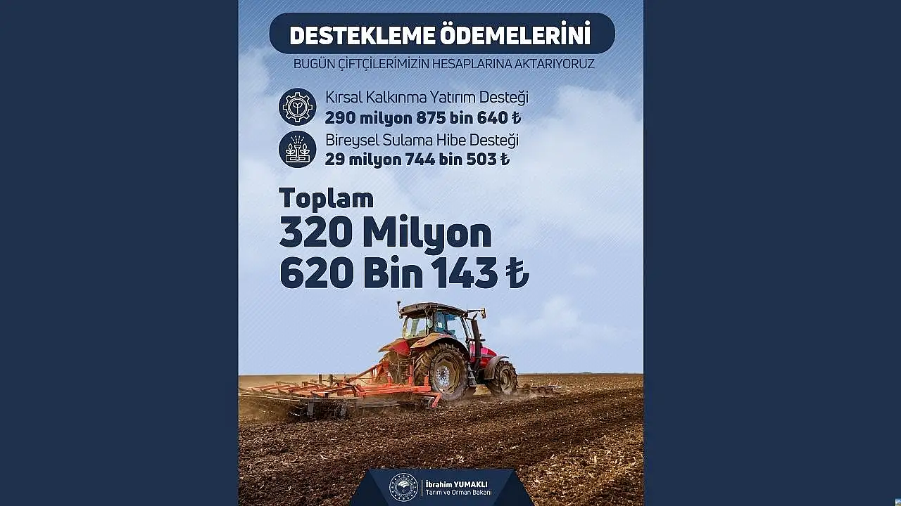Kayseri tarımında beklenen müjde geldi. Tarım ve Orman Bakanı İbrahim Yumaklı, toplam 320 milyon TL’lik destek ödemesinin bugün itibarıyla üreticilerin hesaplarına aktarıldığını duyurdu.