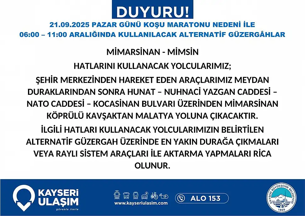 5. Uluslararası Yarı Maratonu dolayısıyla Sivas Caddesi ve bazı yollar yarın sabahtan itibaren araç trafiğine kapatılacak. Cumhuriyet Meydanı da Maraton dolasıyla kapalı olacak. Otobüs güzergahlarını ilgilendiren açıklama Kayseri Ulaşım A.Ş.'den geldi. Detaylar Kayseri Anadolu Haber'de...