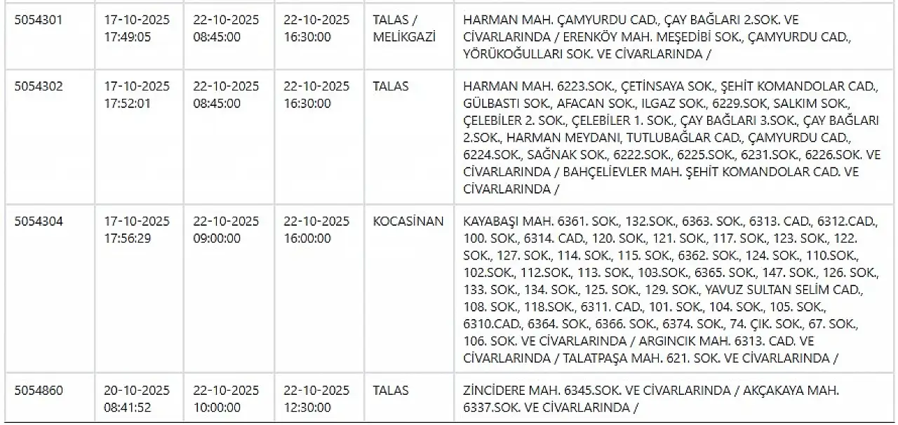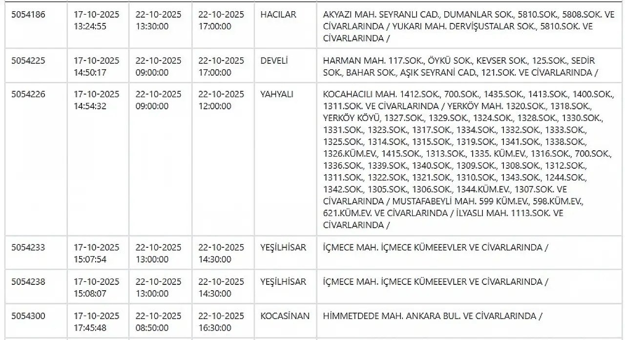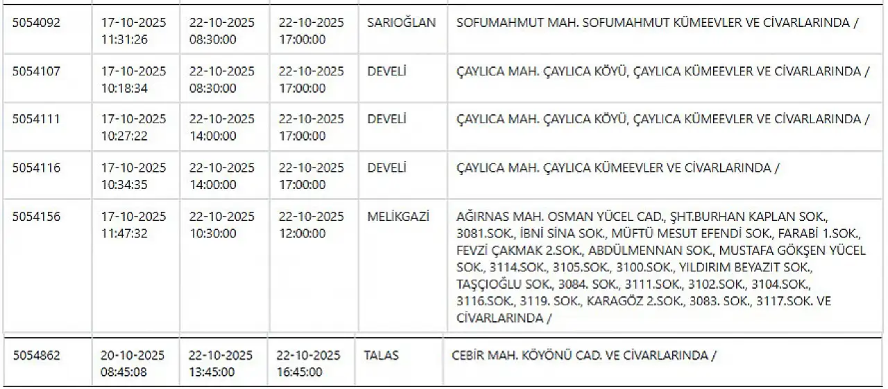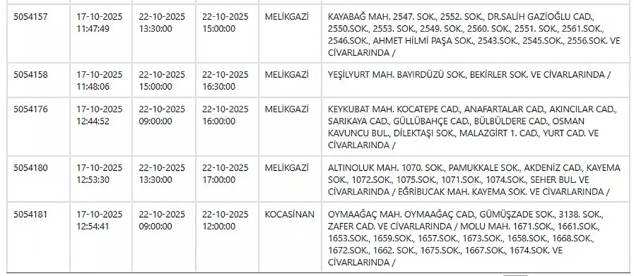 Kayseri'de yarın elektrik kesintileri uygulanacak! 22 Ekim 2025