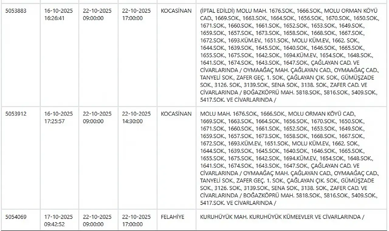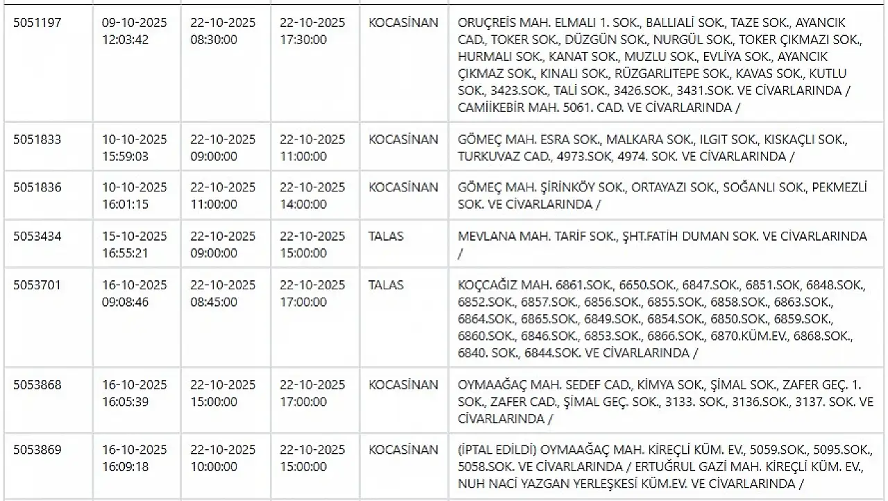 KCETAŞ’tan edinilen bilgilere göre yarın (22 Ekim 2025 tarihinde) aşağıdaki mahallelerde elektrik kesintisi yaşanacak.
