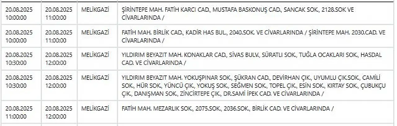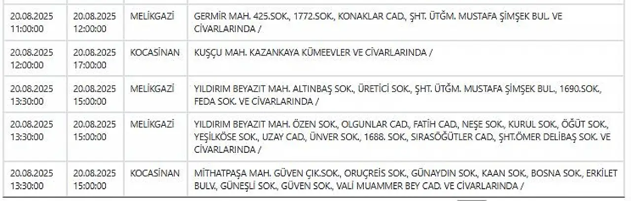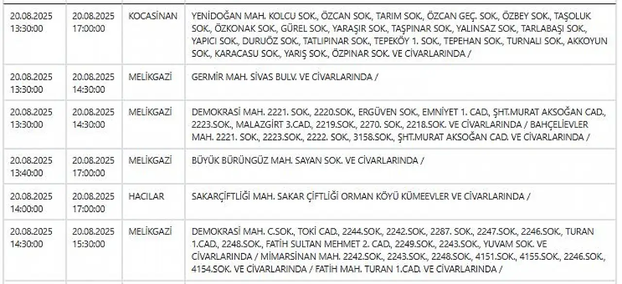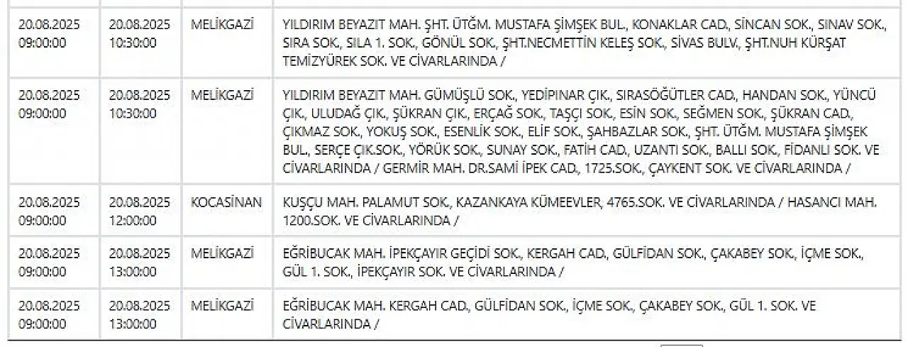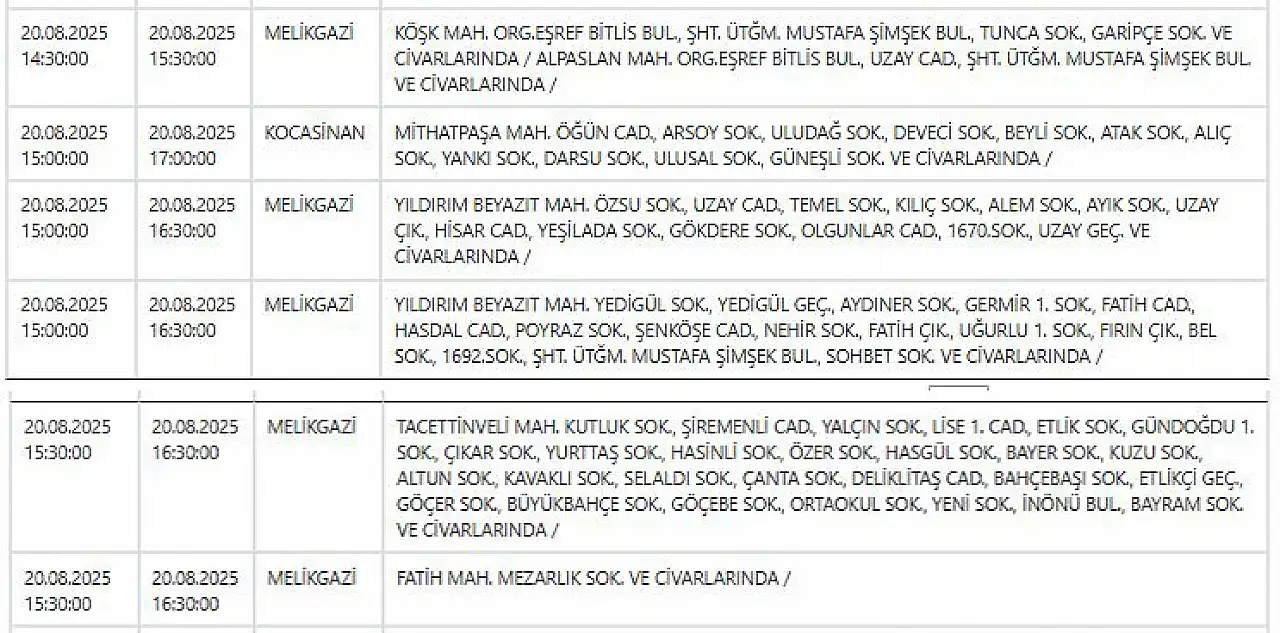 Kayseri'de yarın o ilçelerde elektrik kesintisi yaşanacak? 20 Ağustos 2025
