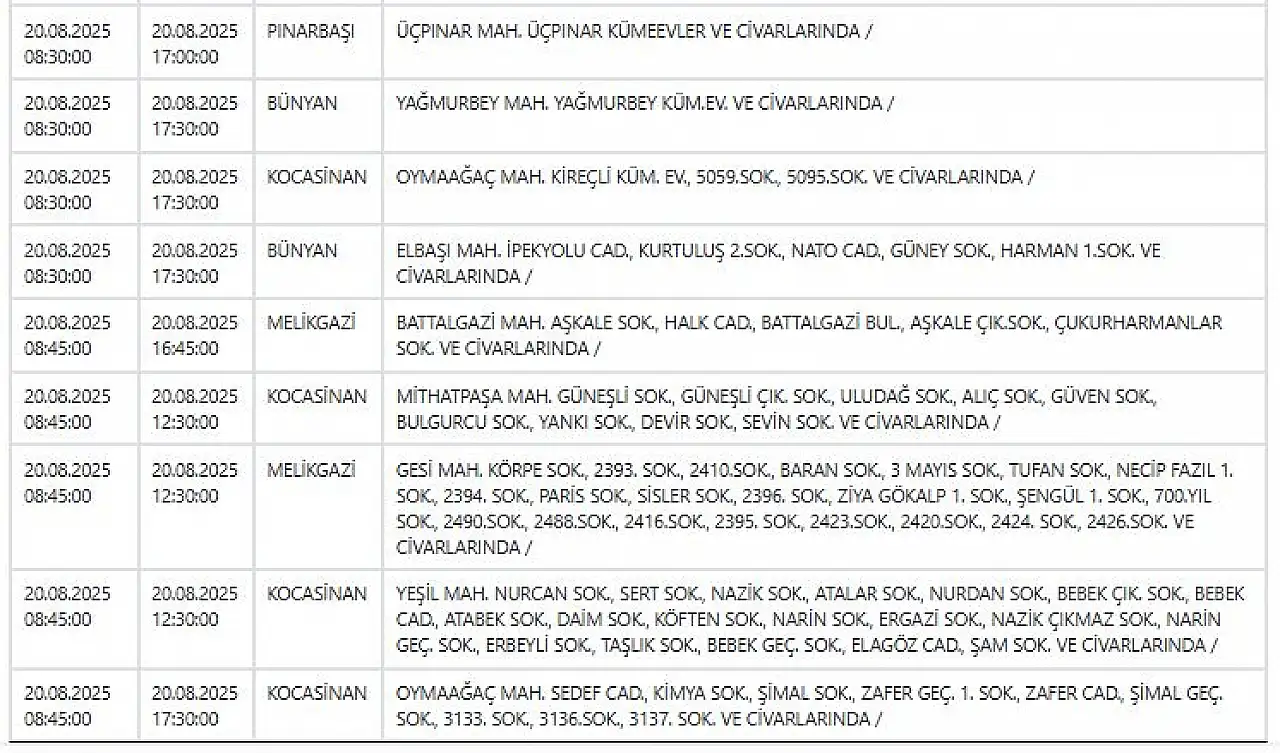 KCETAŞ’tan edinilen bilgilere göre yarın (20 Ağustos 2025) aşağıdaki ilçe ve mahallelerde elektrik kesintisi yaşanacak.