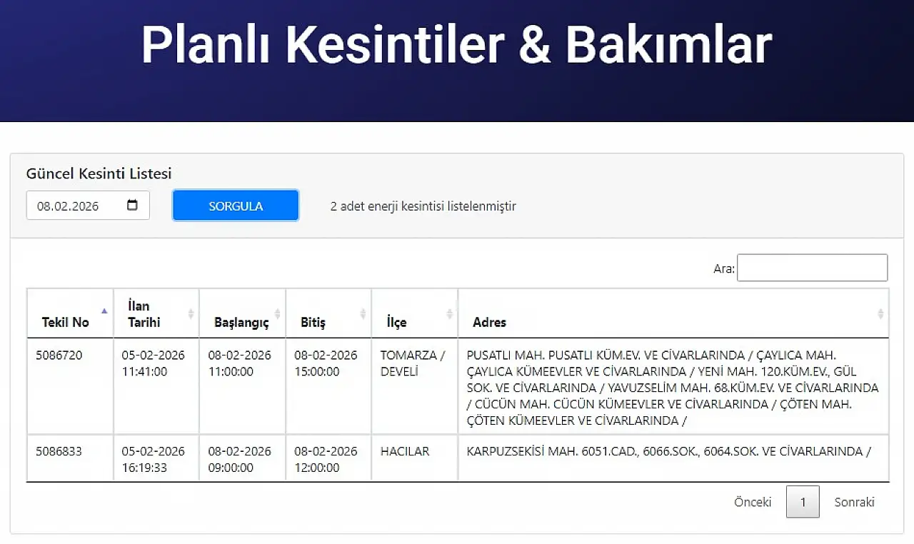 KCETAŞ’tan edinilen bilgilere göre yarın (8 Şubat 2026) aşağıdaki ilçe ve mahallelerde elektrik kesintisi yaşanacak.