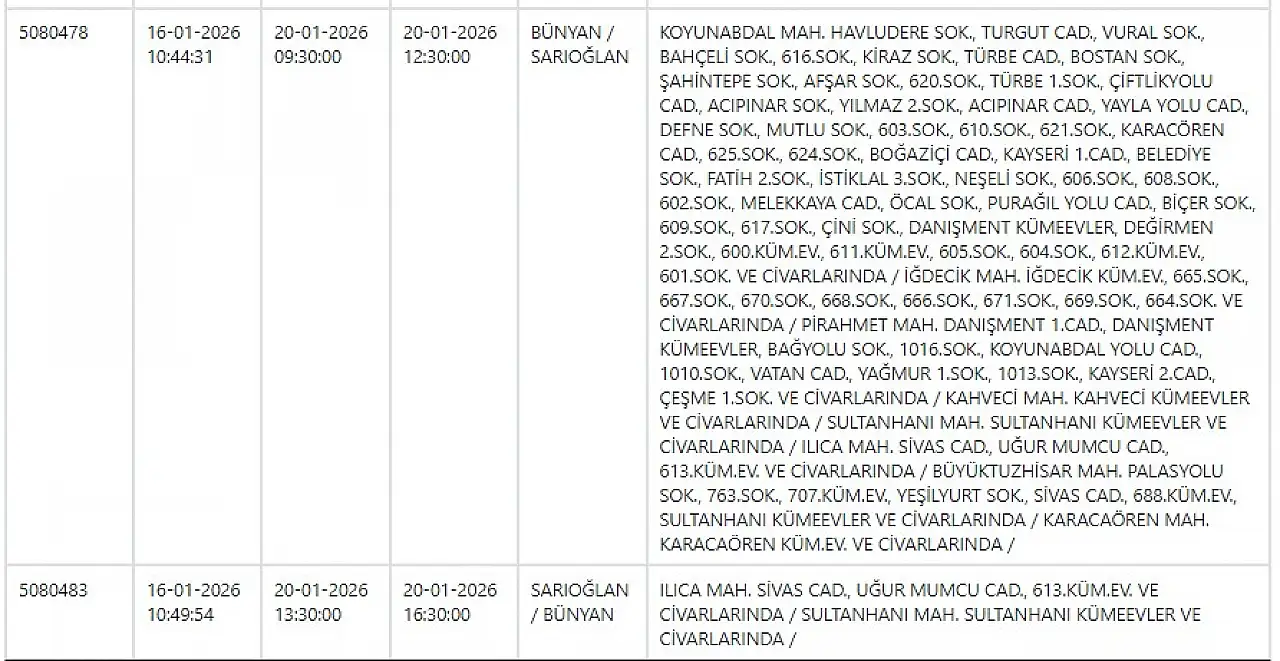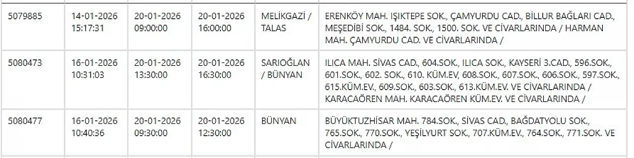 Kayseri'de yarın tüm gün elektrik kesintisi yaşanacak – 20 Ocak 2026