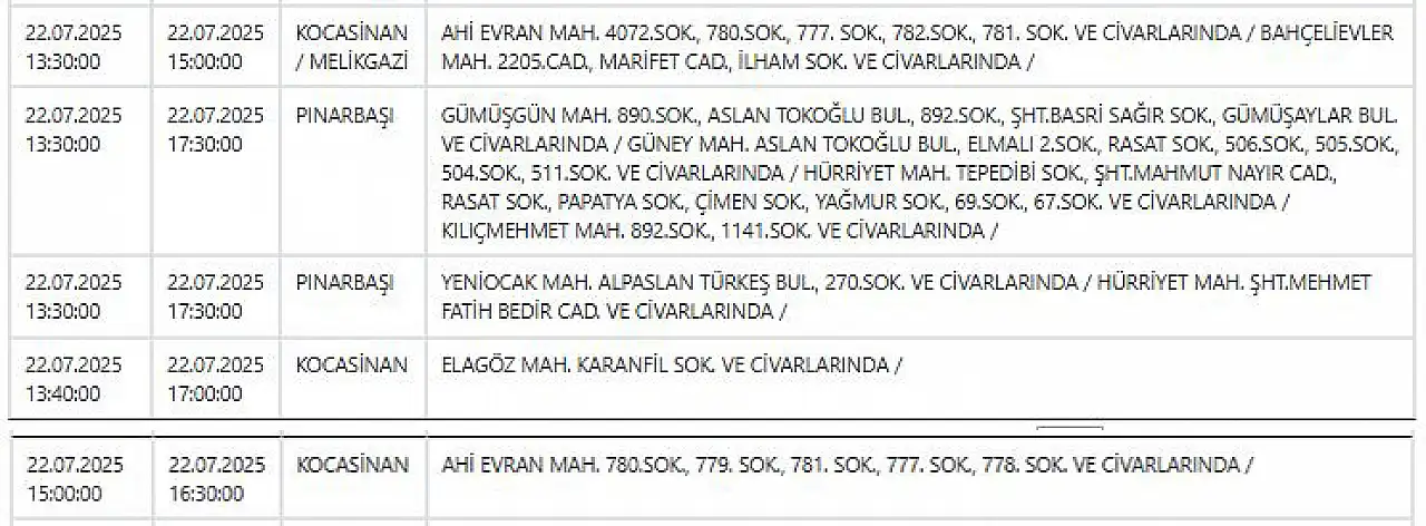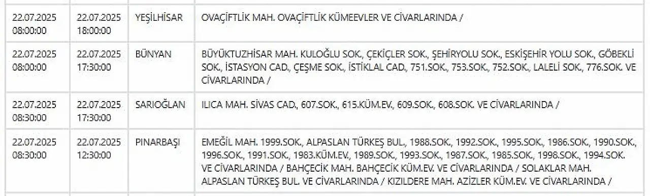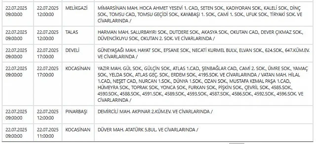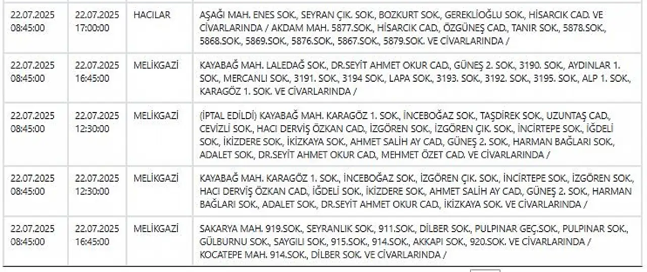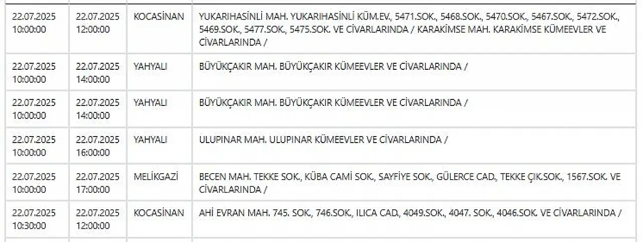 Kayseri'de yarın hangi mahallelerde elektrik kesintisi yaşanacak? - 22 Temmuz 2025
