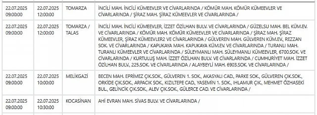 KCETAŞ’tan edinilen bilgilere göre yarın (22 Temmuz 2025) aşağıdaki ilçe ve mahallelerde elektrik kesintisi yaşanacak.
