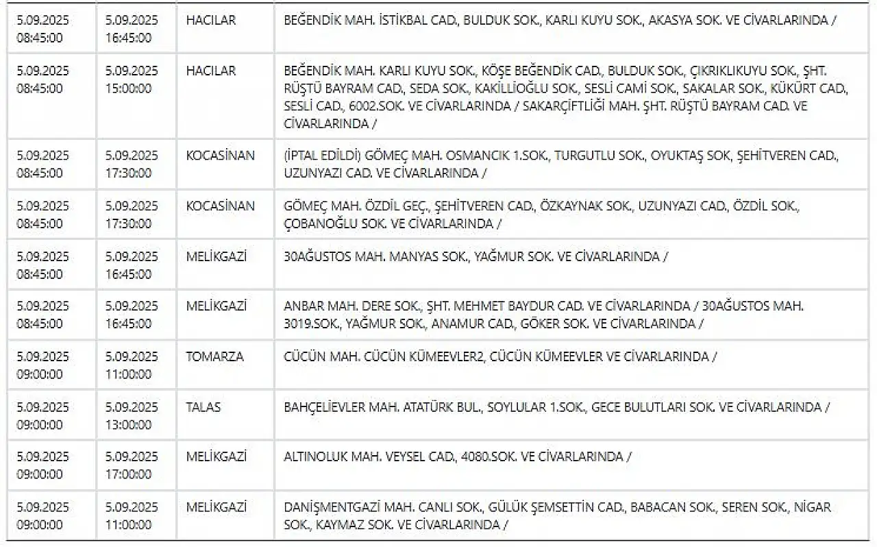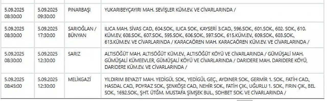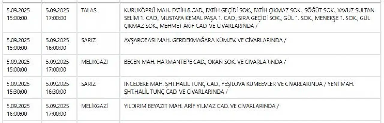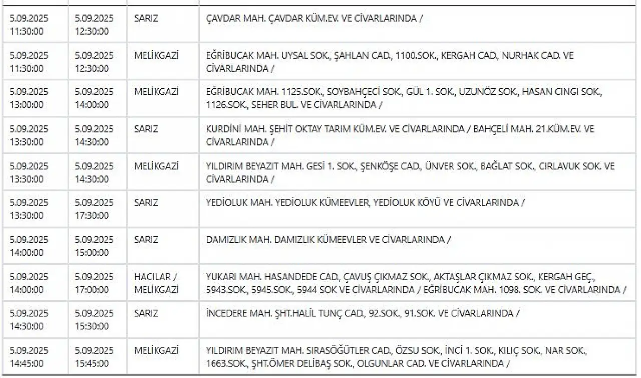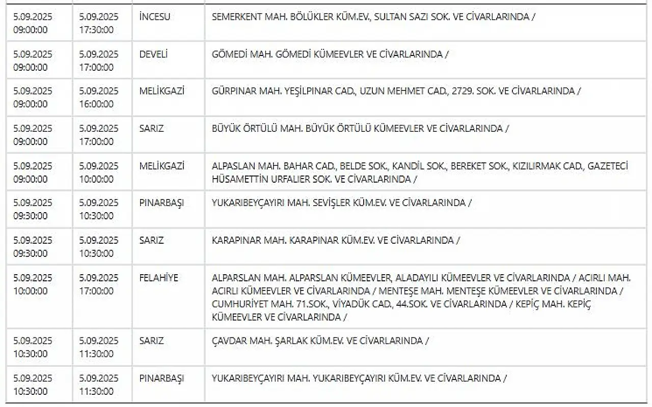 Kayseri'de yarın tüm gün elektrik kesintisi yaşanacak – 5 Eylül 2025