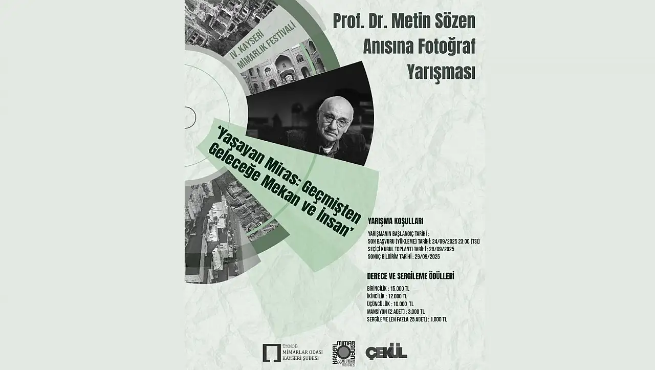 Mimarlar Odası Kayseri Şube Başkanı Murtaza Er yarışma için ‘IV. Kayseri Mimarlık Festivali kapsamında düzenlediğimiz ‘Yaşayan Miras: Geçmişten Geleceğe Mekân ve İnsan’ fotoğraf yarışması, kültürel mirasın korunması ve yaşatılması için ömrünü adamış Prof. Dr. Metin Sözen’in anısına gerçekleştirmek bizim için ayrı bir anlam taşıyor. Sözen Hoca, yalnızca Kayseri için değil, tüm Türkiye için kültürel değerlerin savunucusu, belleğimizin canlı kalması adına yol gösterici bir isim olmuştur.’ dedi.