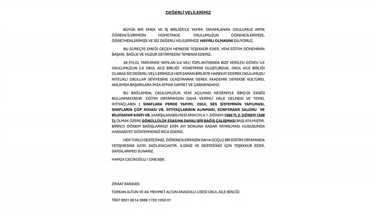Okul Aile Birliği Başkanı tarafından gönderilen mesajda ayrıca Türkan Altun ve Av. Mehmet Altun Anadolu Lisesi Okul Aile Birliği’ne dair iban numarası da paylaşıldı. Bağış yapan ailelerin açıklama olarak çocuklarının ismini yazması talep edildi.