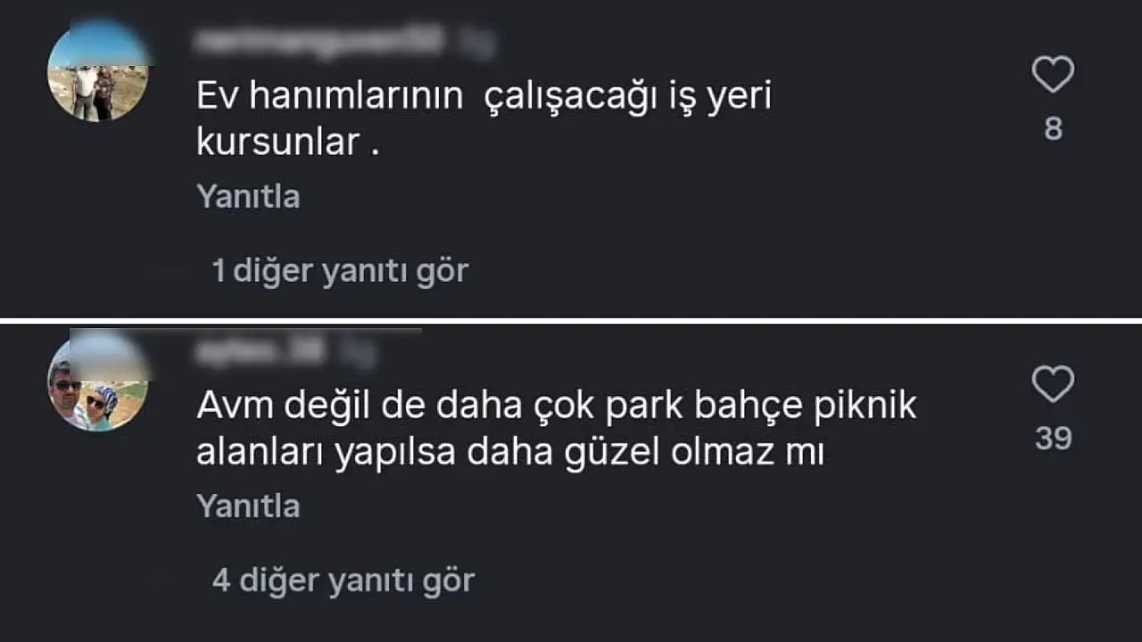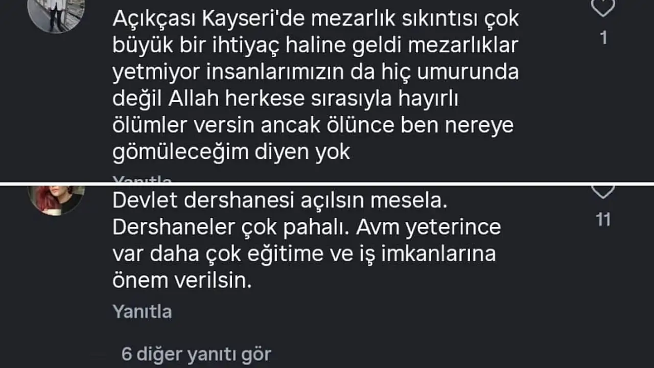 Bazı sosyal medya kullanıcıları ise park, bahçe ve geniş piknik alanlarının Kayseri için daha doğru bir yatırım olacağı vurgulandı. Öte yandan başka bir vatandaş ise şöyle bir yorumda bulundu; ‘Devlet dershanesi açılsın mesela. Dershaneler çok pahalı. AVM yeterince var. Daha çok eğitime ve iş imkânlarına önem verilsin’ dedi.