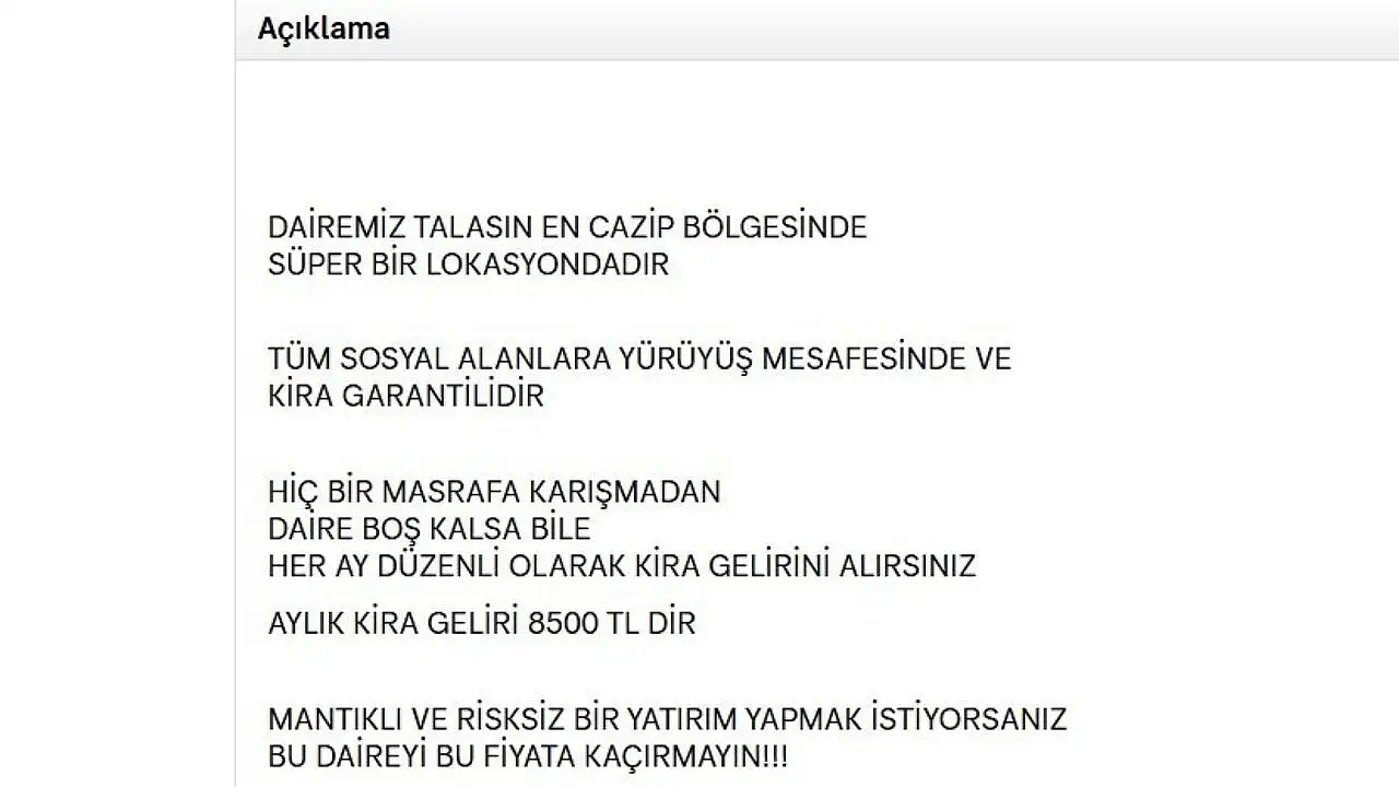 Kayseri’nin Talas ilçesinde yer alan bir satılık daire ilanında şu ifadelere yer verildi; ‘Dairemiz Talas’ın en cazip bölgesinde, süper bir lokasyondadır. Tüm sosyal alanlara yürüyüş mesafesindedir ve kira garantilidir. Hiçbir masrafa karışmadan, daire boş kalsa bile her ay düzenli olarak kira gelirinizi alırsınız. Aylık kira geliri 8 bin 500 TL’dir.’