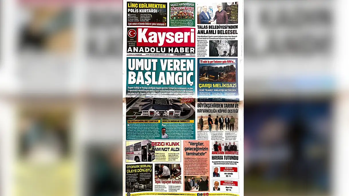 Gazete bugün manşetine Kayseri'de geçtiğimiz yıl açılışı gerçekleştirilen Yeşilay Rehabilitasyon Merkezi'ni taşıdı. Kayseri Valisi Gökmen Çiçek'in açıklamalarının yer aldığı haberde ilk danışanların taburcu edildiği bilgisi paylaşıldı.