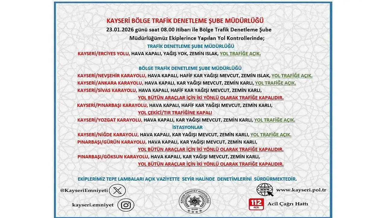 Bugün (23 Ocak) saat 08.00 itibari ile Bölge Trafik Denetleme Şube Müdürlüğü ekiplerince yapılan yol kontrollerinde, Pınarbaşı - Gürün Karayolu, Pınarbaşı - Göksün Karayolu, Kayseri –Pınarbaşı Karayolu, Kayseri - Sivas Karayolunun trafiğe kapalı olduğu aktarıldı.