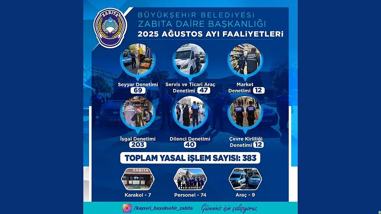 Kayseri Büyükşehir Belediyesi Zabıta Daire Başkanlığı, vatandaşların huzuru ve güvenliği için yürüttüğü çalışmalarına hız kesmeden devam ediyor. Ağustos ayında yapılan kontrollerde toplam 383 işlem gerçekleştirilirken, şehir genelinde seyyar satıcılar, servis ve ticari araçlar, dilenciler, marketler, işgaller ve çevre kirliliğine yönelik denetimler öne çıktı.
