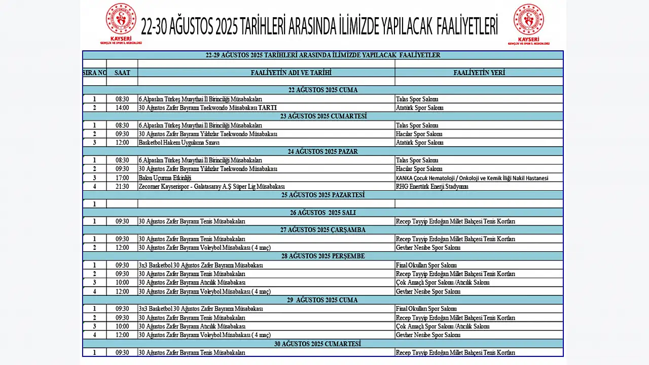 Kayseri Gençlik ve Spor İl Müdürlüğü tarafından yapılan paylaşıma göre Kayseri'de 30 Ağustos Zafer Bayramı Haftasını da kapsayacak şekilde çok sayıda etkinliğe imza atılacak. Düzenlenecek spor müsabakalarının takvimi kamuoyu ile paylaşıldı.