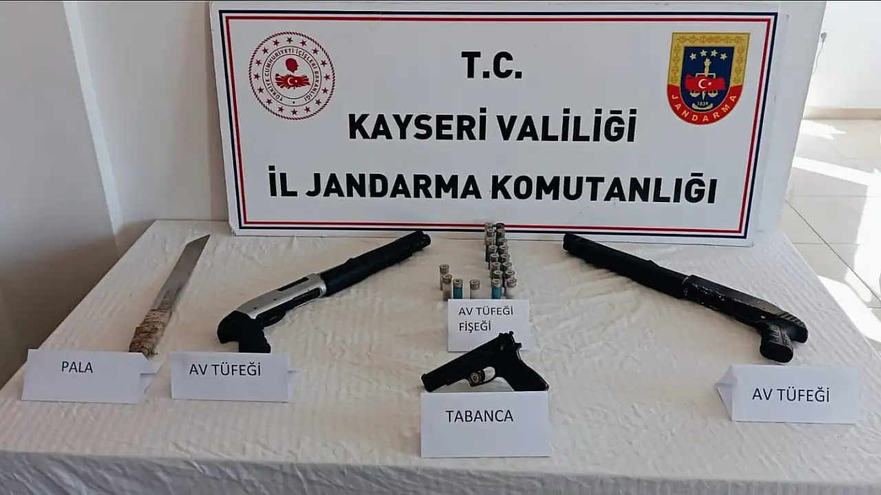 Kayseri İl Jandarma Komutanlığı tarafından yapılan çalışmalarda; Yeşilhisar ilçesinde kullanmak için uyuşturucu veya uyarıcı madde satın almak, bulundurmak ya da kabul etmek suçundan ifadesi alınan A.T.’nin verdiği bilgiler istikametinde ekipler harekete geçti. Alınan ifadede şahsın uyuşturucu maddeyi Kuşçu Mahallesinde mevsimlik tarım işçisi olarak çalışan E.T. isimli şahıstan satın aldığını belirtmesi üzerine, E.T. ve ailesinin ikamet ettiği dört çadırda ve şahıslara ait araçlarında Yeşilhisar İlçe Jandarma Komutanlığı, KOM ve Narkotik Suçlarla Mücadele Şube Müdürlüğü ekipleri tarafından yapılan aramalarda 2 adet pompalı av tüfeği, 20 adet fişek, 1 adet tabanca, 1 adet şarjör ve 1 adet tahta saplı demir pala bulundu.