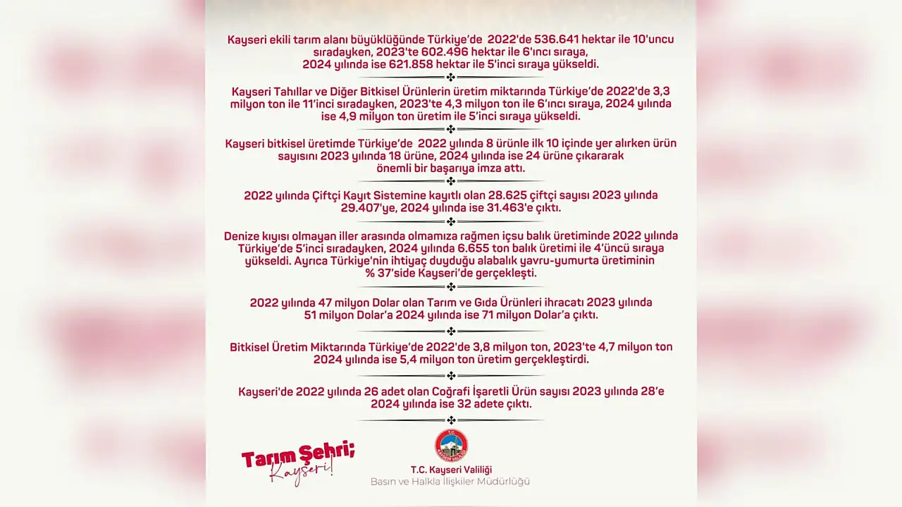 Ekili alan büyüklüğünden bitkisel üretime, içsu balıkçılığından ihracata kadar birçok alanda büyük ilerleme kaydeden Kayseri, tarımsal başarılarıyla Türkiye sıralamasında ilk 5'e girmeyi başardı. Detaylar Kayseri Anadolu Haber'de...