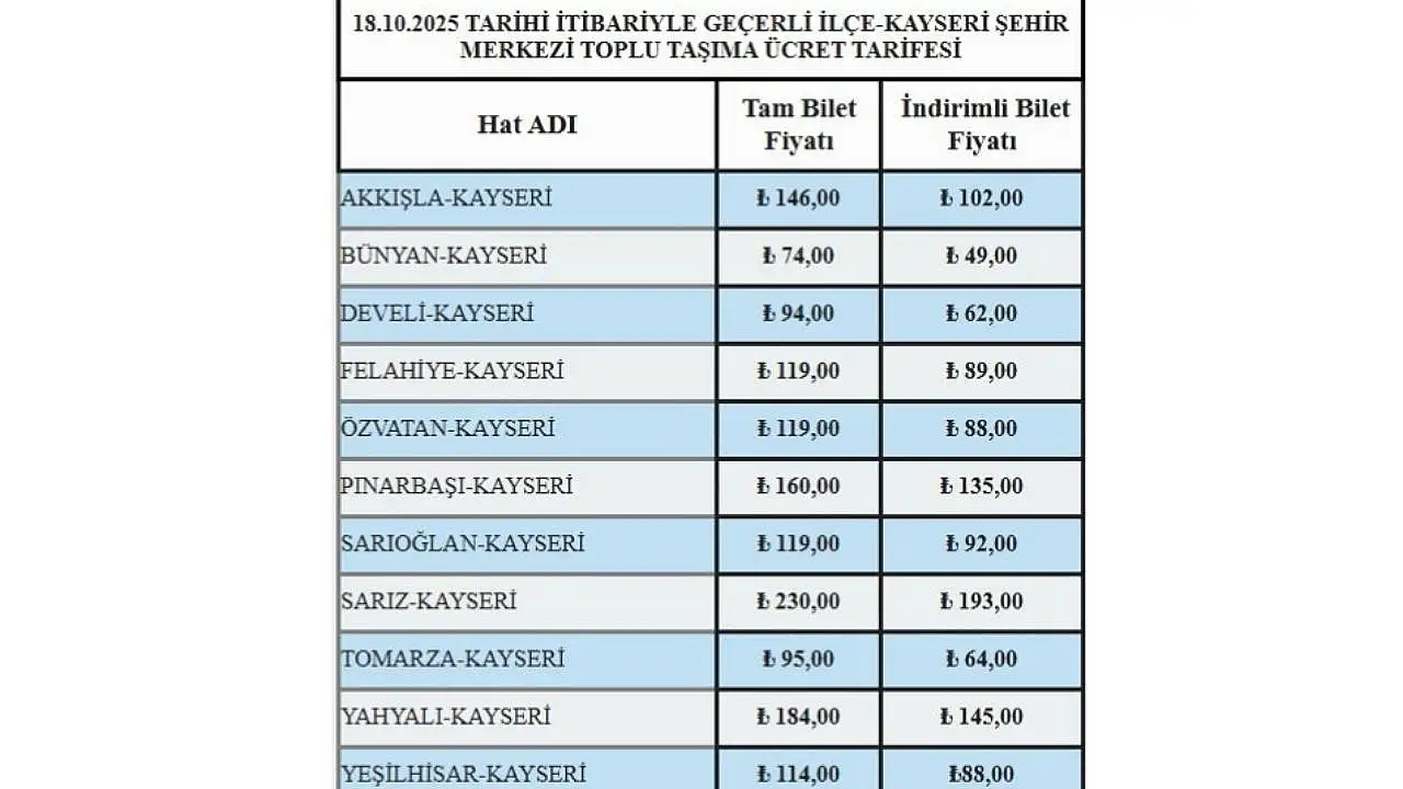 Kayseri Büyükşehir Belediyesi Ulaşım Koordinasyon Merkezi'nin (UKOME) aldığı karar doğrultusunda, Kayseri ve ilçeleri arasındaki toplu taşıma ücretlerine zam yapıldı. Bu zamla birlikte şehrin en uzak ilçesi aynı zamanda en pahalı ilçe oldu.
