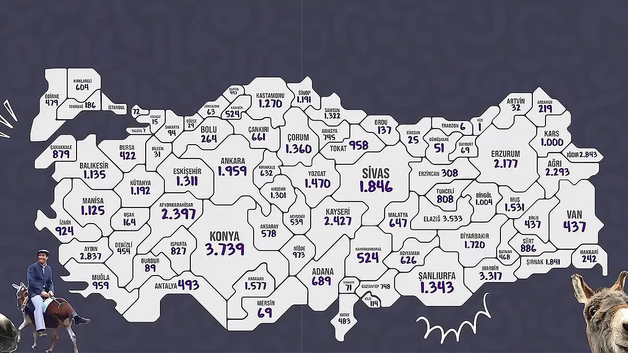 Türkiye genelinde en çok eşeğin bulunduğu iller arasında Konya 3 bin 739 eşekle ilk sırada yer alırken, onu 3 bin 533 ile Elazığ, 3 bin 317 ile Mardin, 2 bin 843 ile Iğdır ve 2 bin 837 ile Aydın takip ediyor. Ardından ise 2 bin 427 eşek ile Kayseri geliyor. Türkiye’de en az eşek sayısına sahip il ise yalnızca 1 eşekle Rize oldu.